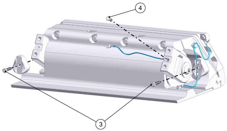 - Install the Blade to the Actuator Arms using the four (4) M8-1.25 x 30 mm Hex Head Bolts and their washers. Slide the free bonding wire terminal end through the elongated hole near the center of the Blade. Before torquing the bolts, push the Actuator Arms firmly down against the Blade supporting edge. Torque these four (4) bolts to 130 in-lbs (14.7 N-m) in an ‘X’ pattern.