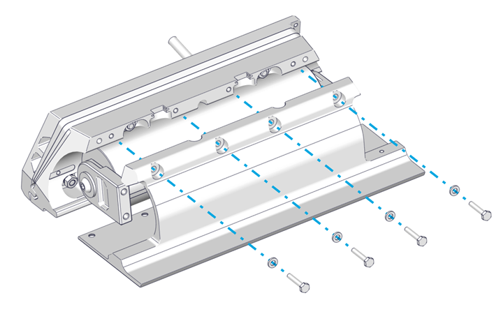 - Install the Blade to the Actuator Arms using the four (4) M8-1.25×20 mm screws and their washers. Before torquing the bolts, push the Actuator Arms firmly down against the Blade supporting edge. Torque these four (4) bolts to 80 in-lbs (9.0 N-m) in an ‘X’ pattern (Figure 72 – Blade Installation).