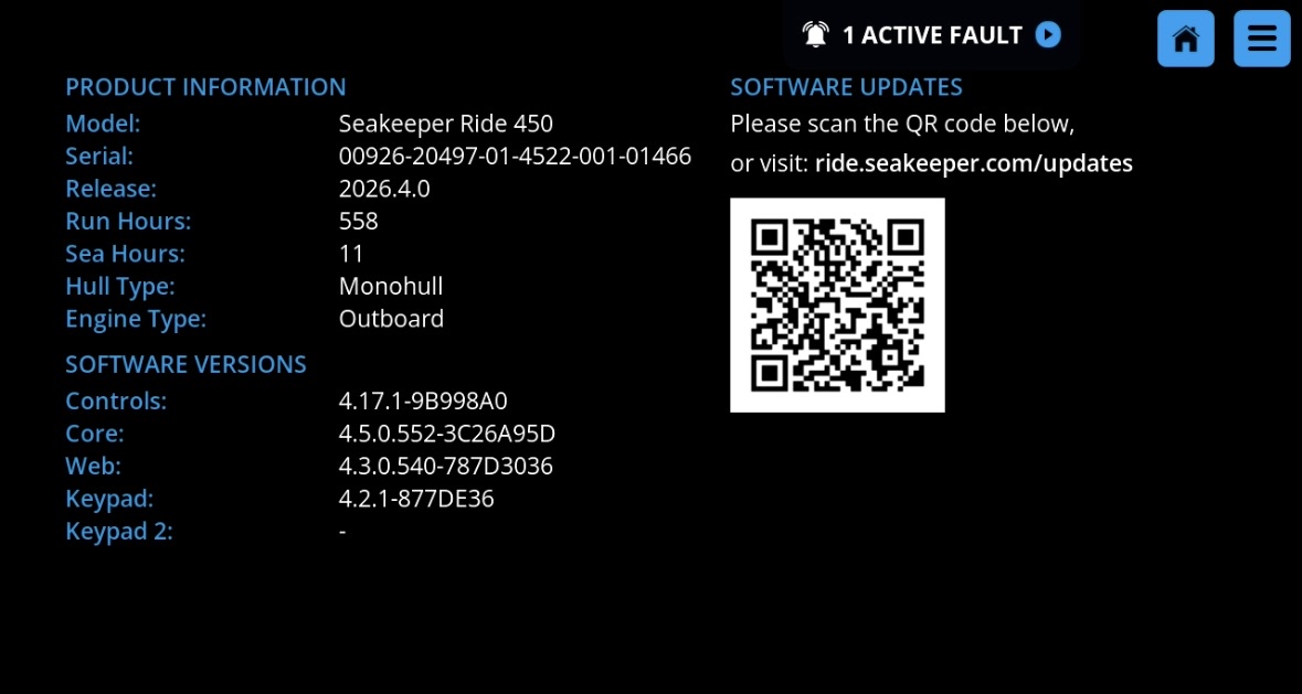 - Info – Provides details about Seakeeper Ride components, sizes, serial numbers, software versions, and other information.