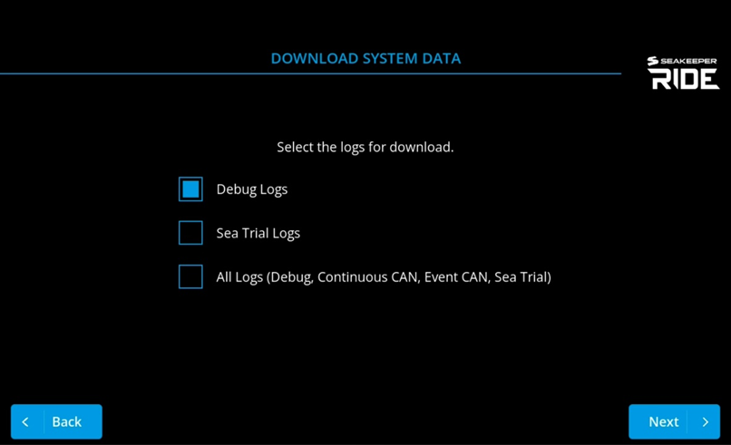 Through Seakeeper Ride Service Menu Items, the ability to offload data can be accessed by users to pull off Sea Trial data. This data will need to be sent to Seakeeper Ride to calculate the results of the completed Sea Trial.
