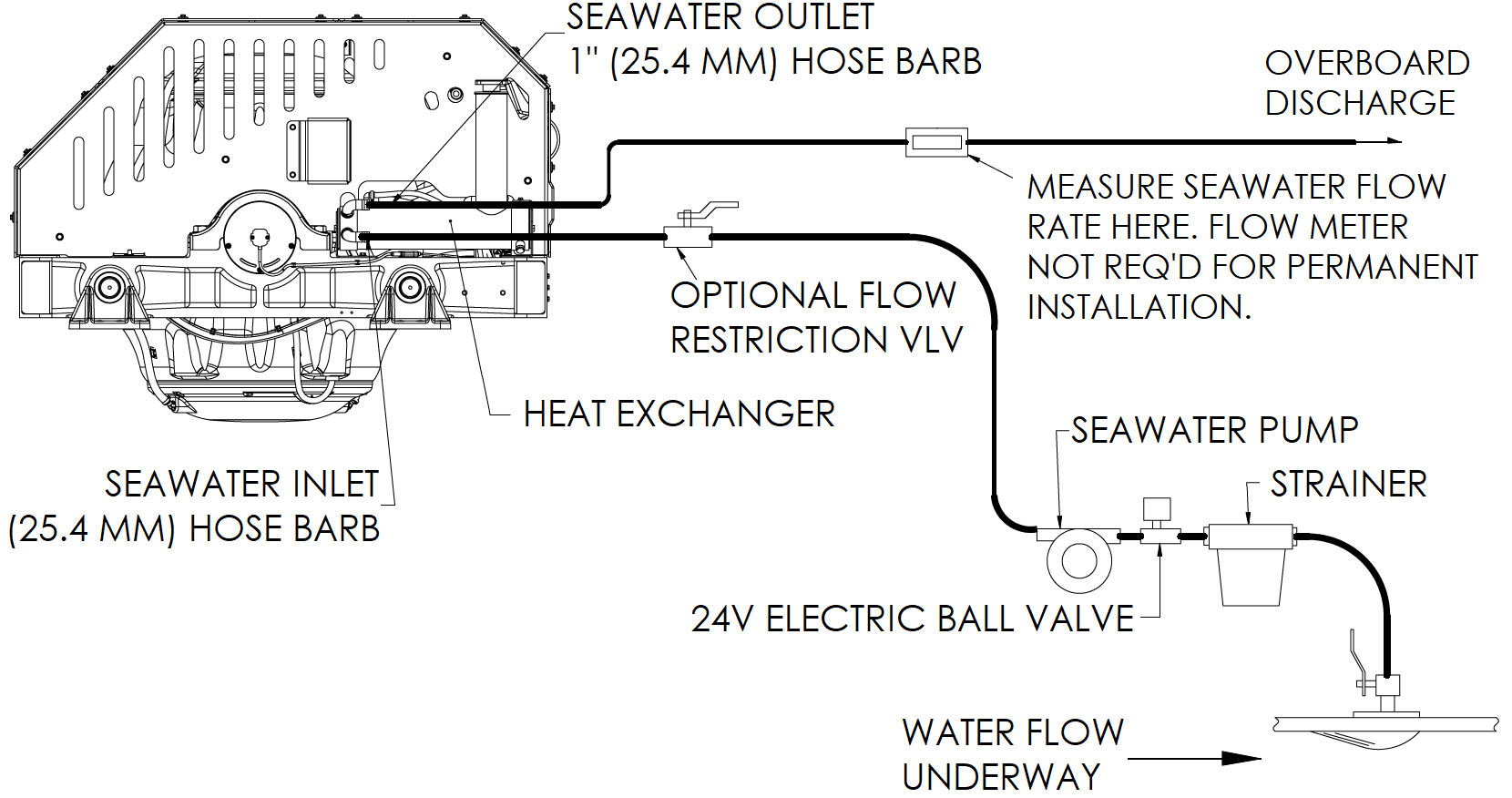 - Installer is responsible for supplying a dedicated seawater pump, motorized ball valve, and associated plumbing. Seawater connections on the heat exchanger mate with 1 in. (25.4 mm) hose. An optional seawater pump and ball valve assembly can be purchased through Seakeeper (P/N 30628).
