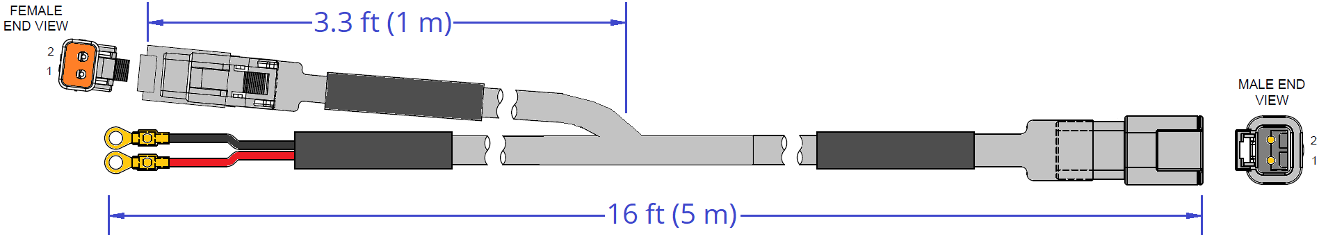 - Seawater Pump Output Cable is a 2 x 12 AWG cable, 16 ft (5 m) length, with a male Deutsch connector on one end and a Y-connector with one female Deutsch connector and a wire with two terminal ring lugs (Figure 21).