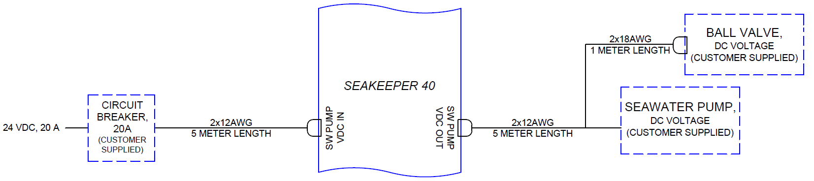 - Seawater Pump Output Cable must be routed and installed in the vessel from the Seakeeper 40 “SW Pump 24 VDC Out” Deutsch connector to the DC Seawater Pump cable. See Figure 22 for details.