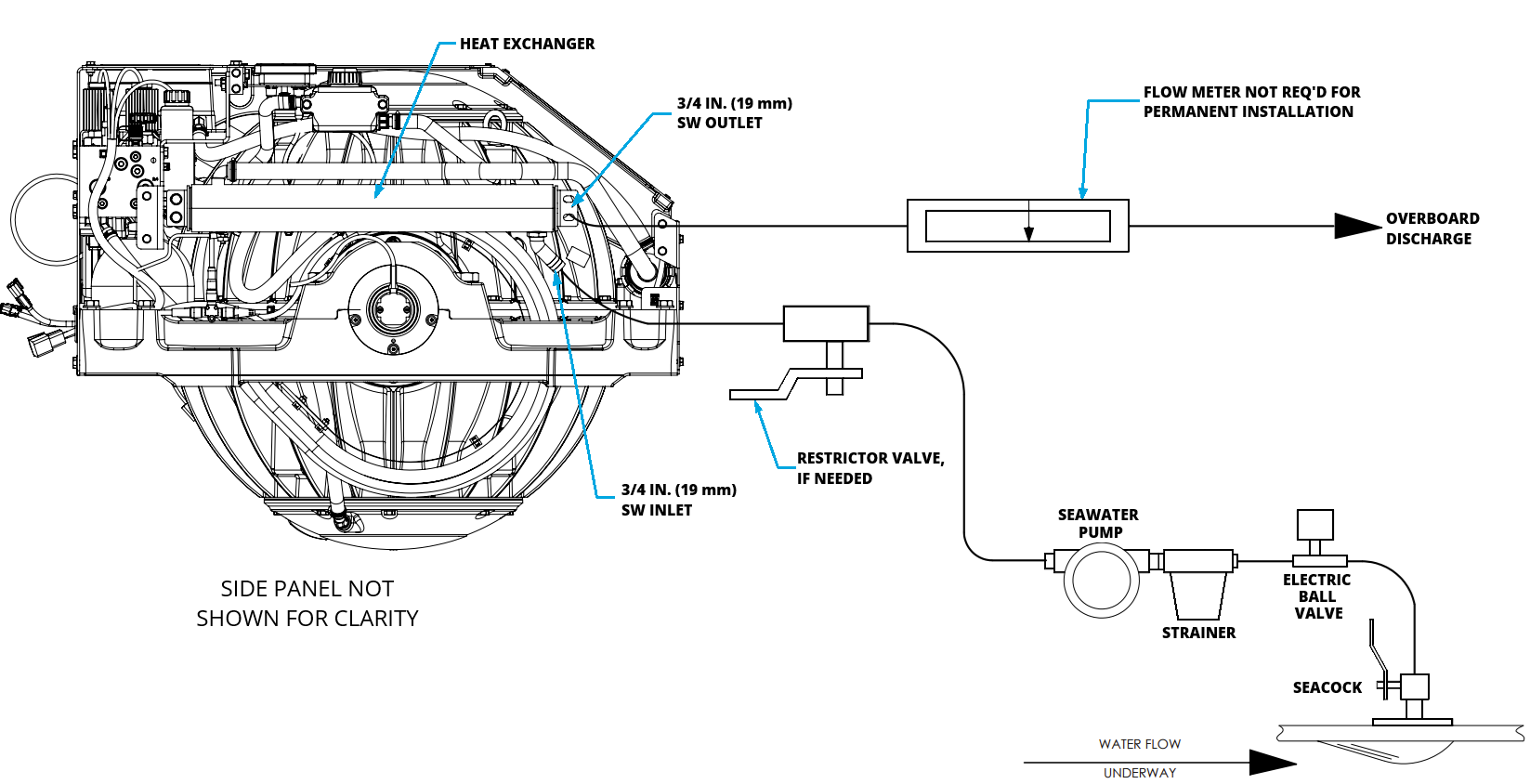 | Override seawater pump “ON” for 5 seconds) and verify flow at seawater outlet. (To activate override, at 0 RPM flywheel speed, hold down SERVICE button wrench icon for 5 seconds to reveal override screen) | |